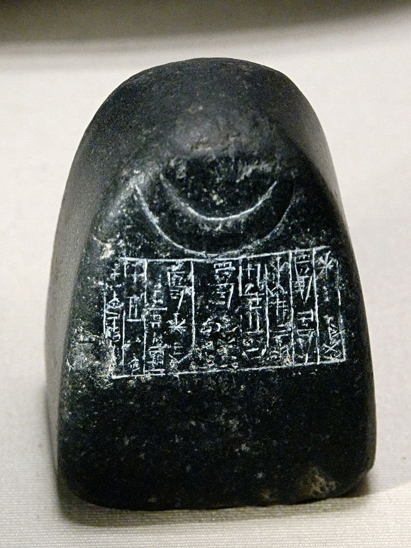 Poids en diorite dédié par le roi Shulgi à Nanna, portant le symbole du croissant de lune.