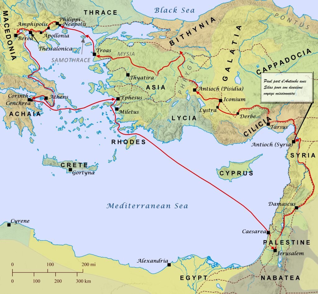 • Puis il se rend à Césarée, Jérusalem, et Antioche. Référence : Actes 18:18-22 .